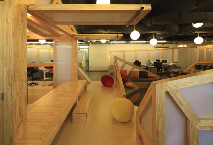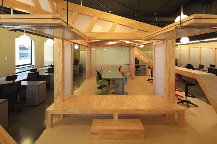 会议室的设计:设计师在设计的时候,将其安置在空间的中心区域,将此处做为中心来设计,在设计师看来会议室是一个企业进步的阶梯,在此地员工自由发挥、畅所欲言,有的坐在吧台区域、有的坐在木材搭建的休息台桌上,在和谐的氛围中大家相互交流,在欢快的氛围中完成让员工可以放开心扉,与企业相互融为一体,感受到自己的责任。