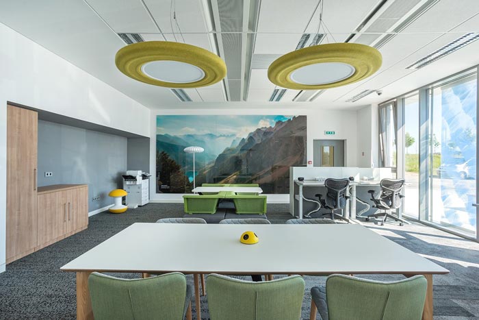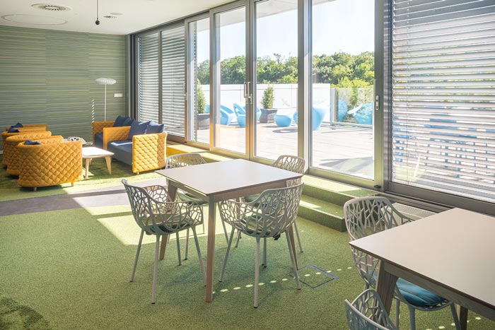 茶水间的设计:此处正对外界的草坪,阳光也明媚、充足,设计师希望给员工一个多功能的休息区域,既可以在室内品尝咖啡,又可以在草坪上玩耍,设计师希望室内与室外之间的间隔,可以在这里打破,让员工在办公的中途,也可以接触到外界的世界。