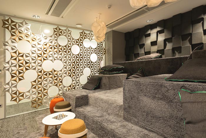 阅读区域的设计:进入此空间有一个必要的动作就是脱鞋,因为这里采用的都是无菌的可躺卧的地毯,在这里员工可以根据自己的习惯,来调整看书的姿势,同时这里也没有吵闹,给读书营造了一个完美的空间,读书使人成长,这也是企业希望看到的,企业希望人才可以不断的自我成长。