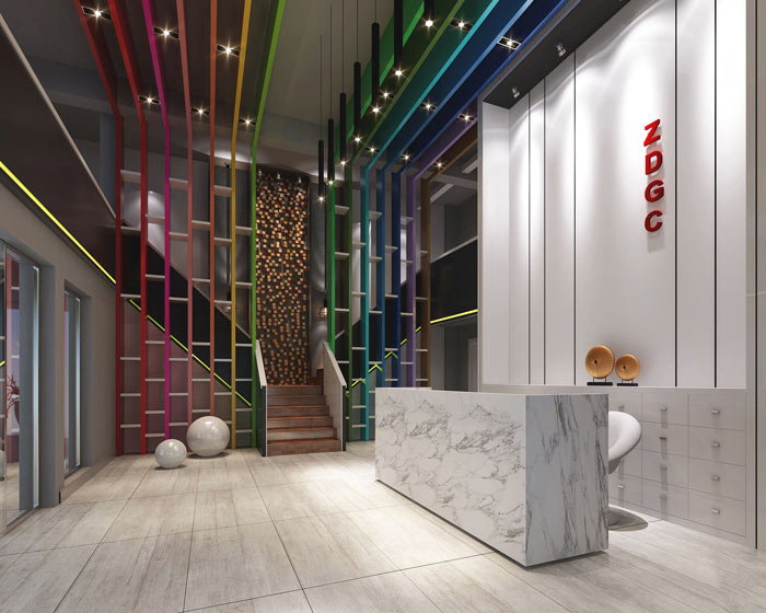 前台区域的设计,设计师在设计的时候,重点在于表达动线的完善对于企业的重要性,在设计师看来经过楼梯的双边设计,可以有效的进行节流,让客户可以井然有序的进入企业空间,在此也变相的说明了动线对于空间的重要性。