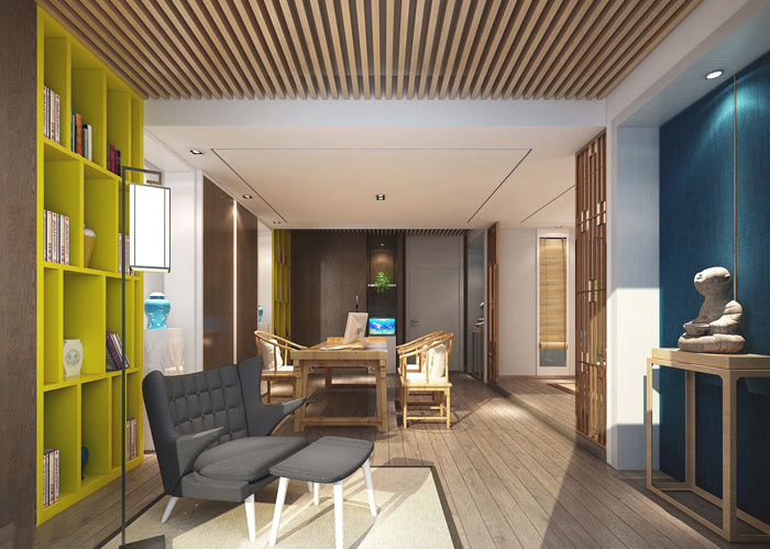 总经理办公室的设计,设计师在设计的时候,重点在于表达禅的意境,同时设计师将简约风也融入其中,在设计师看来越是简约的空间,越有利于人思维的发展与开拓,设计师希望这样的设计可以在无形中提升主案设计师的心境。
