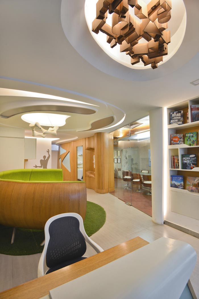 接待区域的设计:设计师在设计的时候,将其安置在前台区域的后方,在形状的选择上,设计师选用了半圆形,在设计师看来这样的设计有其天然的优越性,半圆形在此处瞬间感觉空间突然上升了一个层次,同时又不会对整体空间造成影响,做到实用与形象并存。