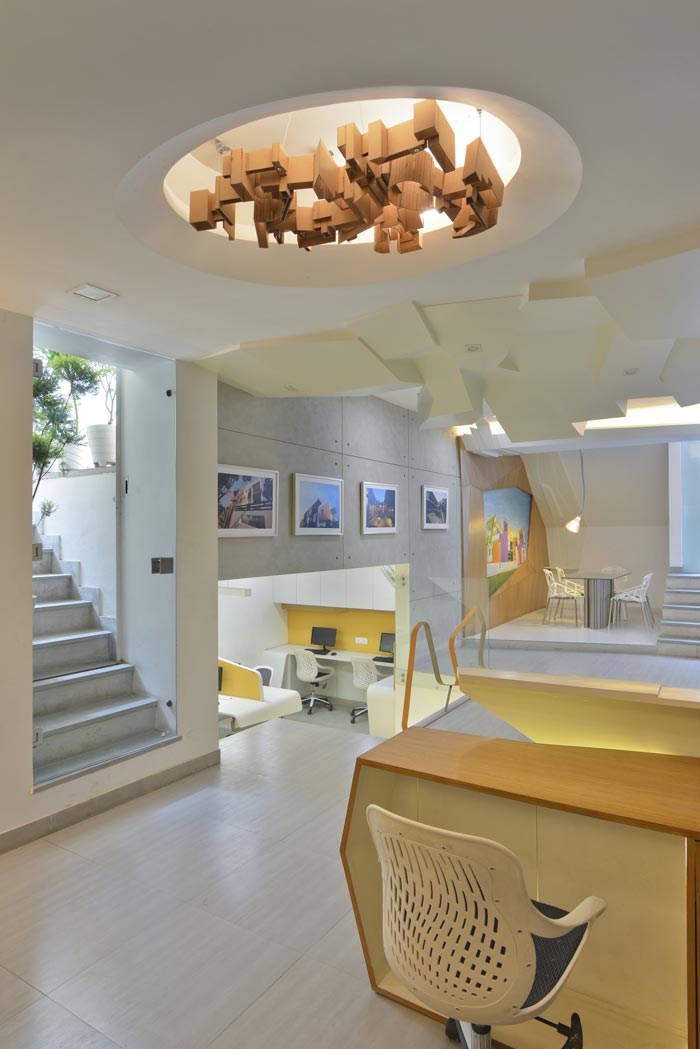 办公区域的设计:设计师在设计的时候,将其安置在错落有致的地下空间,在设计师看来这样的设计可以将空间很好的进行区分,在此处给人以柳暗花明又一村的感觉,让人凭空产生别有洞天之感,忍不住想要观赏整个空间,激发客户强大的好奇心,在好奇心的引导之下逐渐去了解企业的一草一木。