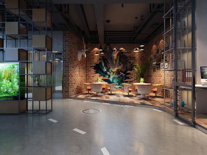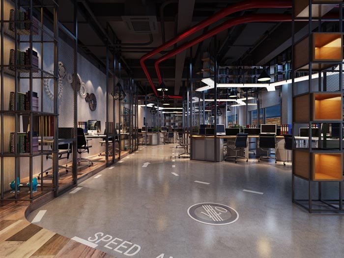 办公区域的设计,设计师在设计的时候,采用1:2:7的设计手法,1分为单人办公区、2分为动线、7分为开放式办公区域,这样的设计手法一方面可以使空间利用最大化,另一方面工业风融入室内之后,为空间带来了一丝活力。